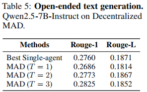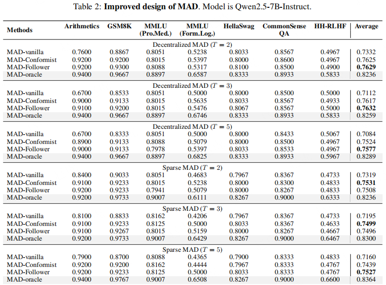 我们将这种方法称为 MAD-oracle,并在表 2 中报告其性能。该方案相较于标准多智能体辩论(MAD)实现了显著性能提升,且始终大幅超越 “多数投票” 基准。例如,在 “5 轮去中心化多智能体辩论” 中,MMLU(形式逻辑)任务的准确率从 0.5000 提升至 0.6825。