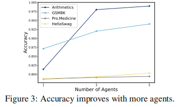 为更深入理解多智能体辩论组件的作用,我们开展了消融实验(见图 3):分析参与每轮辩论的 Qwen2.5 智能体数量(从N=1到N=5)对性能的影响。总体而言,智能体数量越多,性能通常越高。这一趋势进一步表明:多智能体辩论的有效性可能主要源于 “多智能体集成效应”。下一节将通过理论分析形式化这一观察。