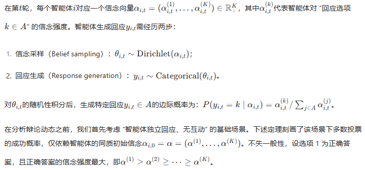 除实证观察外,我们在第 4 节还提出了一个理论框架,严谨解释智能体的不确定性与信念更新如何在 “投票” 和 “辩论” 中影响群体决策。该框架的核心是将每个智能体建模为受 “狄利克雷 - 复合多项式(DCM)分布” 控制的随机过程:通过狄利克雷先验捕捉智能体的内部信念不确定性,通过多项式采样模拟输出的随机性。这一建模方式与真实大语言模型的行为高度吻合 —— 由于不确定性与随机生成过程(如温度采样或核采样),大语言模型对同一问题可能生成不同输出。