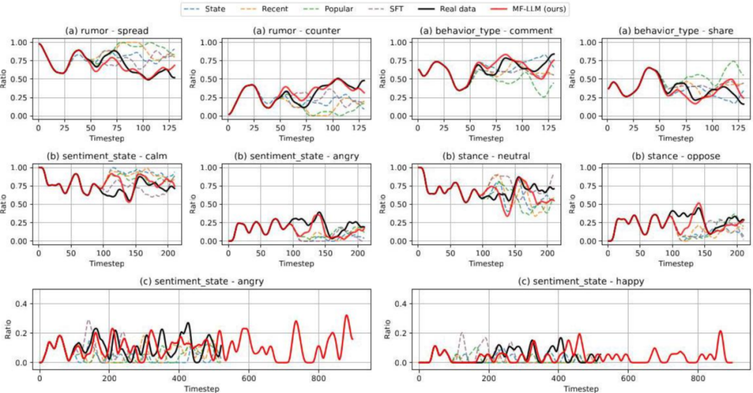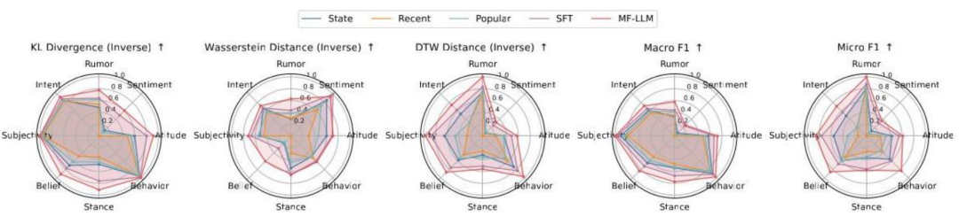 方面 B: 语义保真度——捕捉集体行为的意义。除了轨迹对齐之外,本文评估 MF-LLM 对集体决策语义结构进行建模的能力,通过五个分布度量和八个动作语义维度来衡量保真度。本文评估了 20 个涉及多达 300 个智能体的真实世界事件,比较了四个基线模型 (状态、近期、流行、SFT) 和本文的 MF-LLM(红色) 在 5 个分布指标和8个动作语义维度上的雷达图。面积越大表示性能越优,MF-LLM(红色) 显示出最高的语义保真度。
