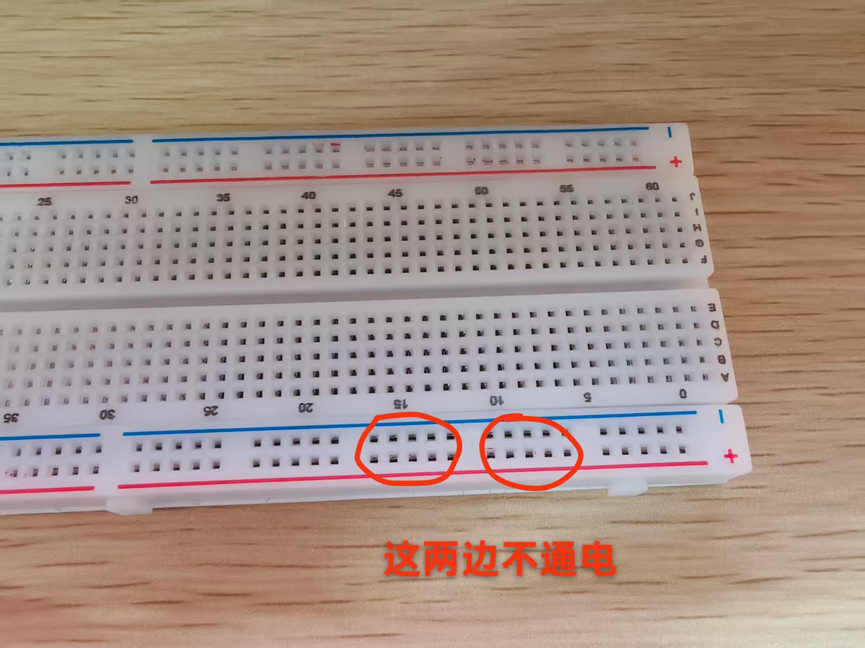 3.用另一种接法接电路,LED灯却不亮,后面是在其他组同学上去总结他们遇到的问题时,才知道面包板正负极间隔大块的两边是不通电的
