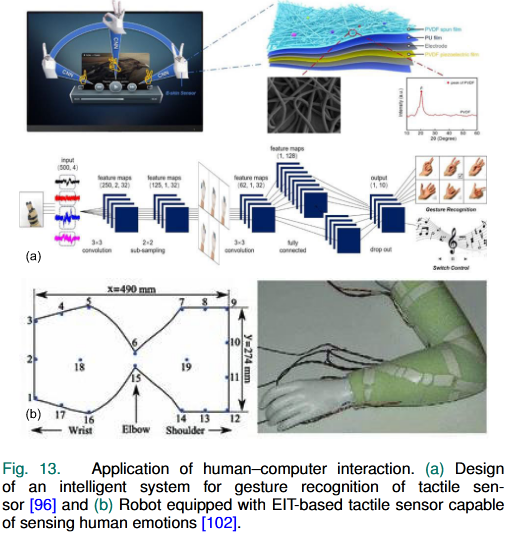 - 情感识别(图 13 (b)):人工手臂装 EIT 传感器,能分辨人是 “轻拍”(友好)还是 “紧握”(紧张),未来机器人能理解人的情绪。
