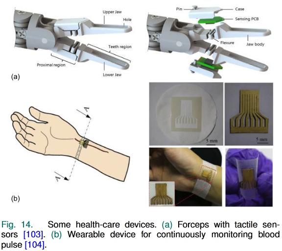 - 生理监测(图 14 (b)):手腕上戴压阻传感器,能连续测脉搏、血压,甚至贴在腹部测呼吸(比如给老人或病人用,不用插管子);