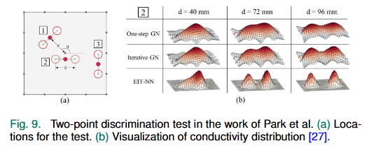 - 例子 1:EIT-NN(一种 AI 模型)—— 比传统算法(GN 算法)更准:空间分辨率指标 RES50 从 75% 升到 83%,RES75 从 82% 升到 90%(数值越高越准),两点触摸也能分清(图 9);