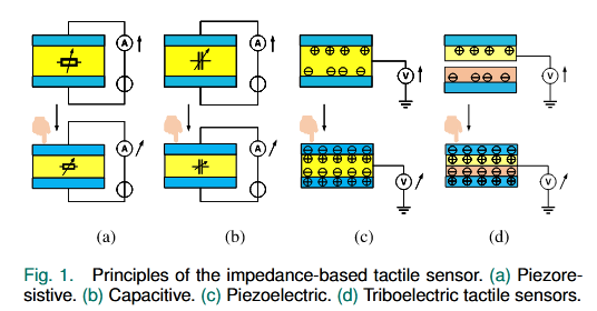 “阻抗式触觉传感器” 的东西,它能模拟人的皮肤 “摸东西”—— 能感知压力、温度,甚至区分物体纹理。比起超声、光学传感器,它便宜、反应快,还能做成柔性的(比如贴在机器人手上、做成可穿戴设备)。它有 4 种基本的 “工作原理”(压阻、电容、压电、摩擦电)和 3 种 “结构”(独立阵列、网状、断层成像),它能用来做机器人抓手、手势控制、手术器械、互动玩具这些实际场景。