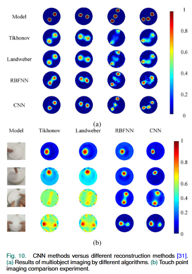 - 例子 2:CNN(卷积神经网络)—— 比其他算法(Tikhonov、Landweber)误差小:RMSE(误差值)低至 0.1,ICC(相似度)高达 0.9(表 2),多目标触摸(比如同时按 3 个点)也能准确识别(图 10 (a)),不会出现 “伪影”(比如明明按一个点,算法画成两个点)。