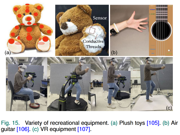 - 空气吉他(图 15 (b)):不用真吉他,戴一个手势传感器,做 “弹弦” 的动作,就能发出吉他声,随时随地玩;