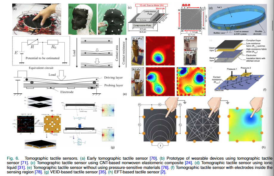 “阻抗式触觉传感器” 正好能解决这些需求 —— 它的核心是 “通过测量‘阻抗’(类似电流的‘阻力’)变化来感知触摸”,比其他传感器(比如电磁、光电)更划算、结构更简单,还能做成 “类皮肤” 的样子。另外,论文还提到一个关键技术叫 “电阻抗断层成像(EIT)”,简单说就是 “不用在传感器内部布线,只靠边缘的电极,就能画出‘哪里被触摸’的图像”,特别适合大面积、柔性的场景(比如机器人全身皮肤)。
