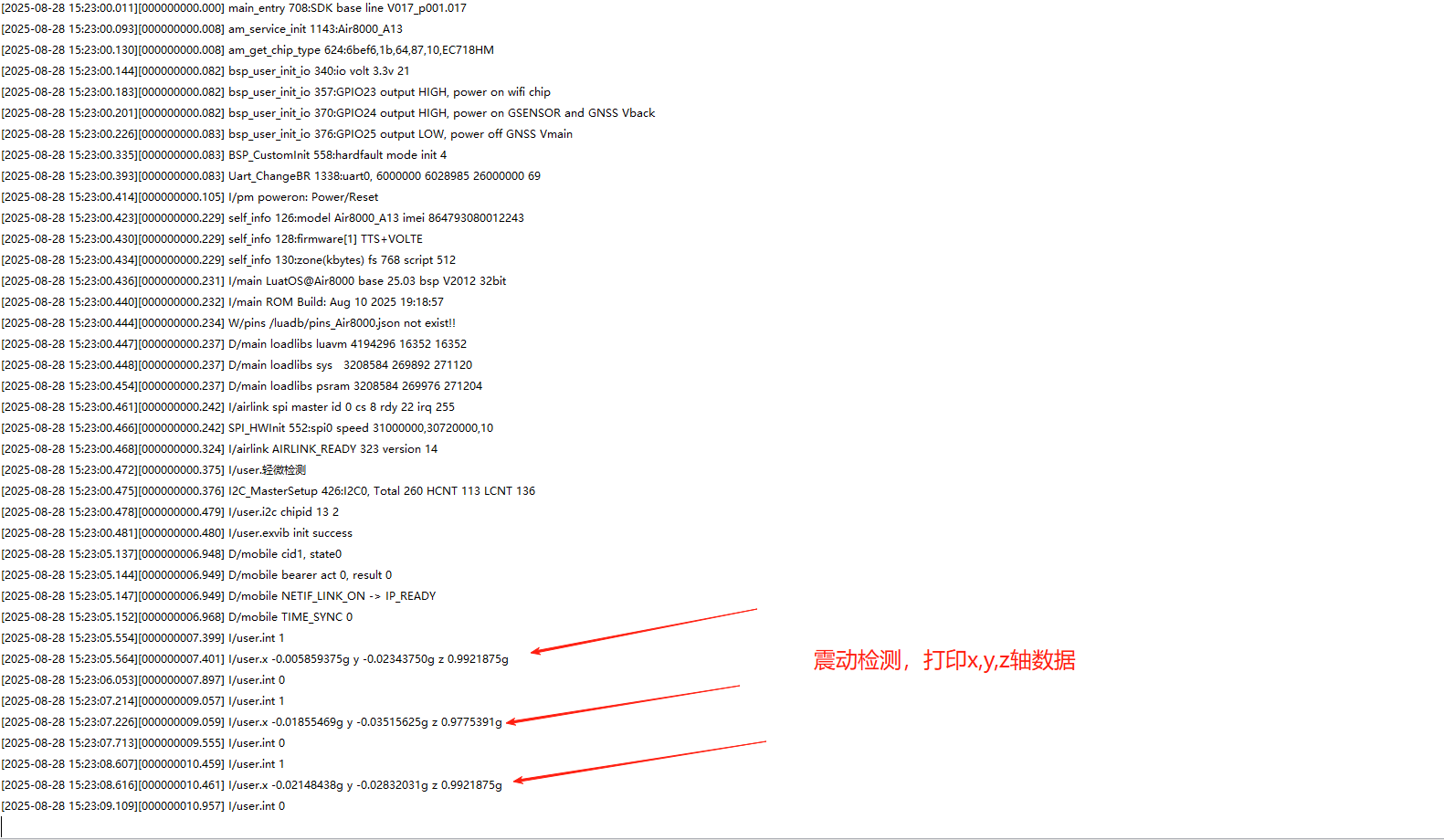 本示例介绍了如何用 Air8000 开发板展示内部三轴加速度传感器的震动触发功能