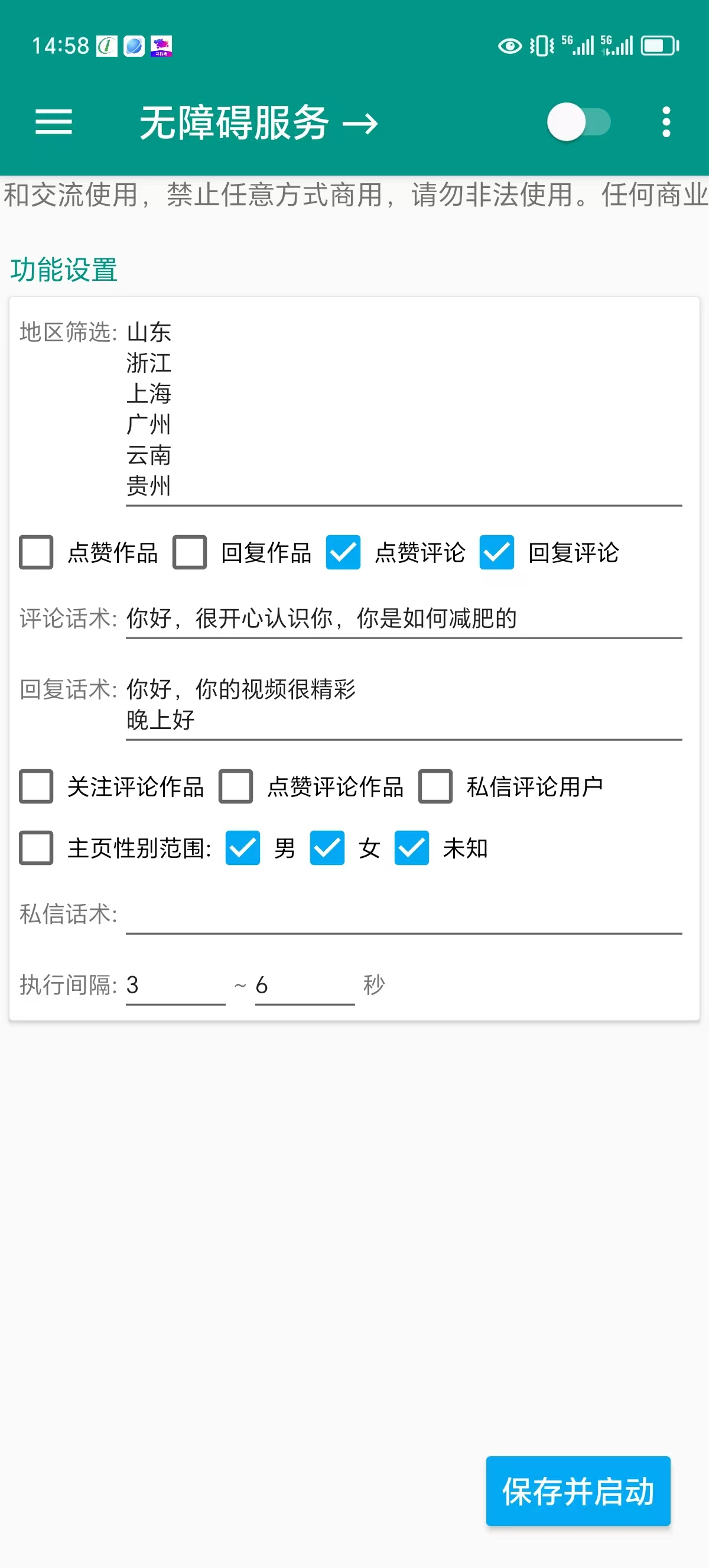 1.选择要打私域的功能,比如回复评论,点赞评论,自动私信等等,还有性别筛选也很重要,功能小伙伴们可以看图文上的