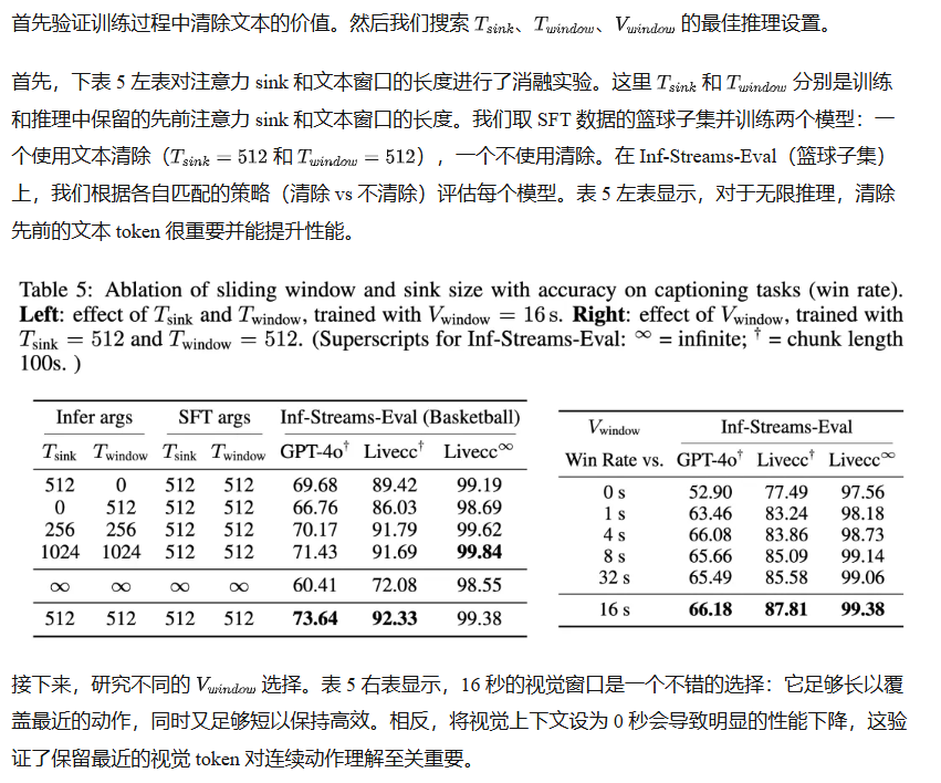 SFT 策略 如下表 6 所示,采用重叠训练策略后,SFT 子集帮助模型适应交错的视觉–文本模式,并理解超长视频。与仅在 Live-WhisperX-526K 上训练的模型相比,在重叠 SFT 数据上训练的模型增强了对无限视频的感知,在 Inf-Streams-Eval 上相较 GPT-4o-mini 的胜率提升 +31.29,在 Livecc-Sports-3K cc 上相较 LLaVA-Video-72B-Qwen2 的胜率提升 +3.68。