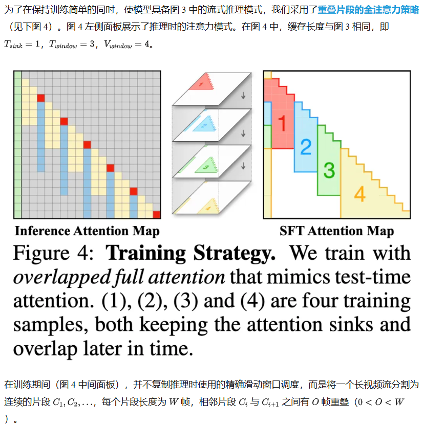 训练阶段(Streaming-aligned SFT): 使用短视频片段的全注意力训练,片段间存在重叠,以此模拟推理时的注意力模式,无需在超长视频上训练。