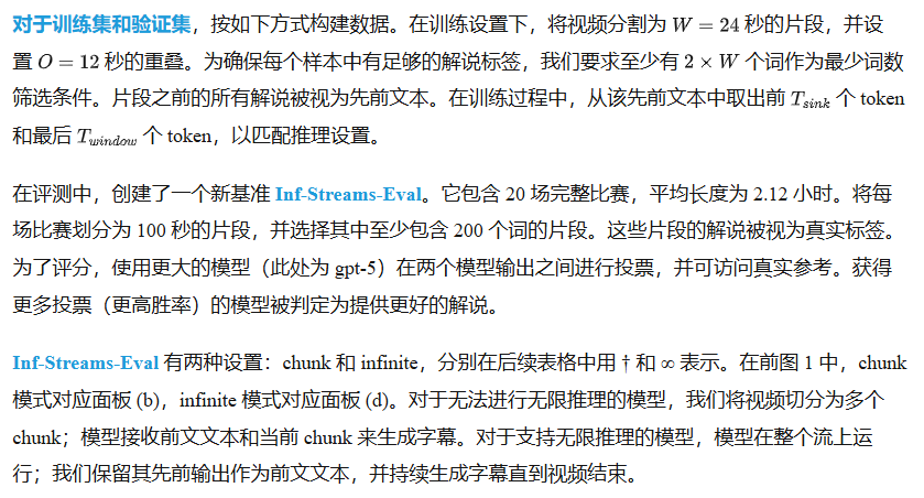 对于字幕生成,使用 Inf-Streams-Eval(平均长度 2.12 小时),测试长时解说能力;以及 LiveSports3K-CC 基准(49 种运动,416 个片段,每个≥10 秒)。