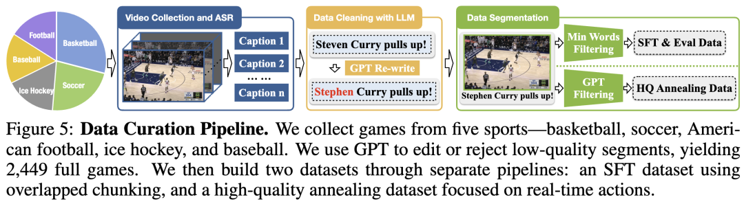因此,制定规则并使用 GPT 清洗这些数据。首先将一场比赛划分为 120 秒的片段,并将每个片段内的解说内容拼接起来,然后拆分为句子。使用该片段及视频标题(包括比赛时间和双方队伍)作为上下文,要求 GPT-5 模型根据规则作出决策,选项包括 “keep”(保留)、“delete”(删除)和 “edit”(编辑)每个句子。