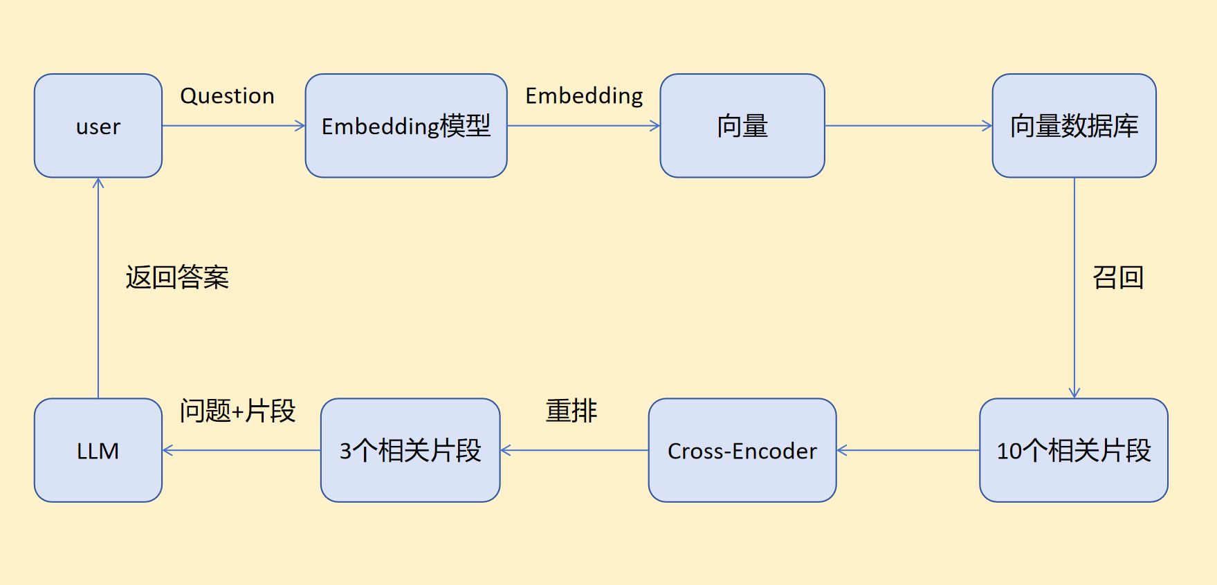 这里大家不免会有一个疑问,不是已经召回一次了吗,完全可以在召回阶段选出三个向量相似度最高的片段结果,为什么还要继续重排这一步骤?是的没错,我们确实可以在召回或者重排任一阶段选出3个高相关性的片段向量。