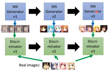 生成式对抗网络,核心是两个模型Generator与Discriminator。二者相互反馈,最终实现生成预期图片。起初的Generator是什么都不懂的,其生成的随机图片交由Discriminator进行评判,Discriminator初始也只会对图片库进行简单的学习。为了“骗过”Discriminator,Generator会不断调整,同理Discriminator也会为了应对进行升级