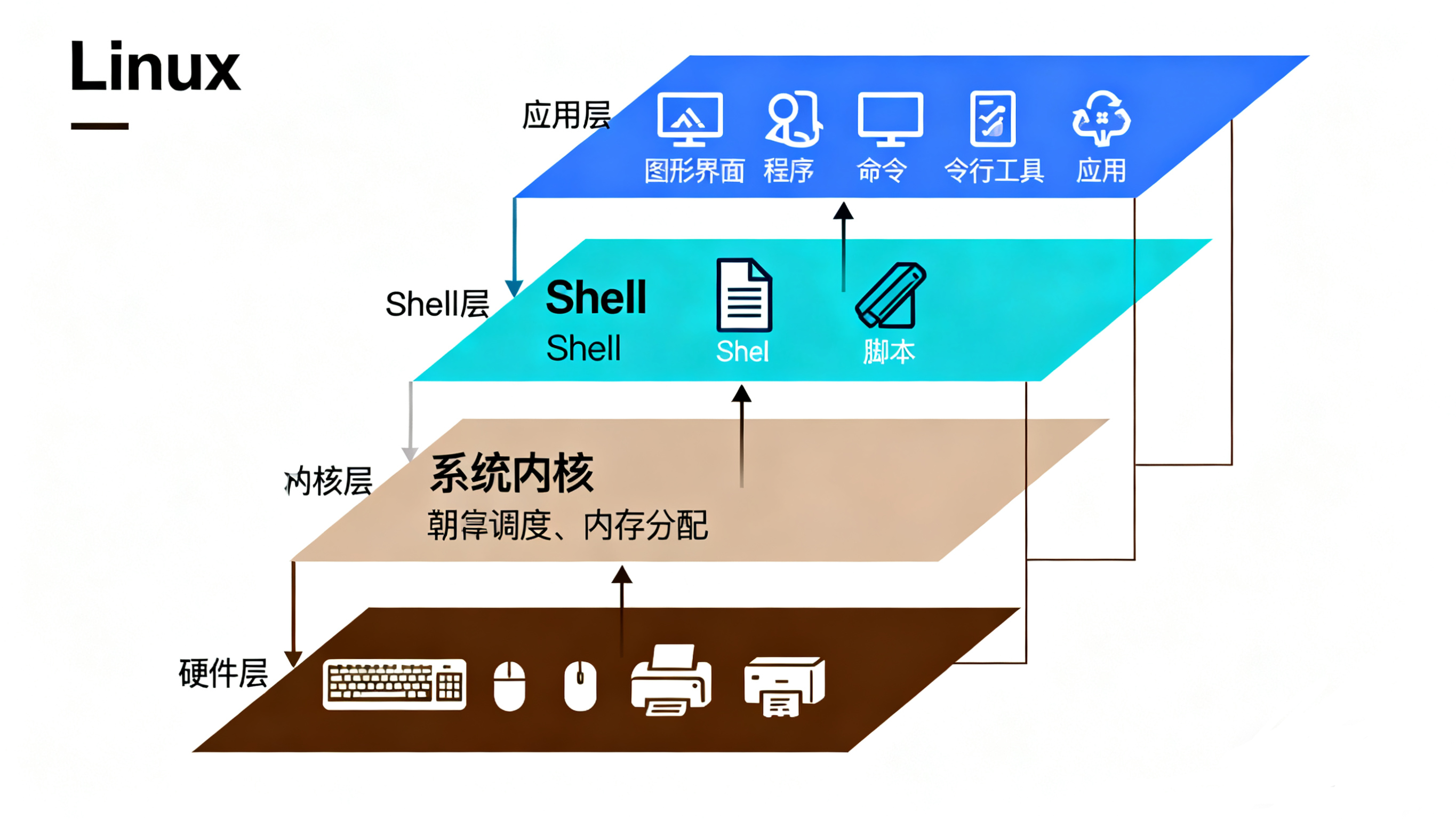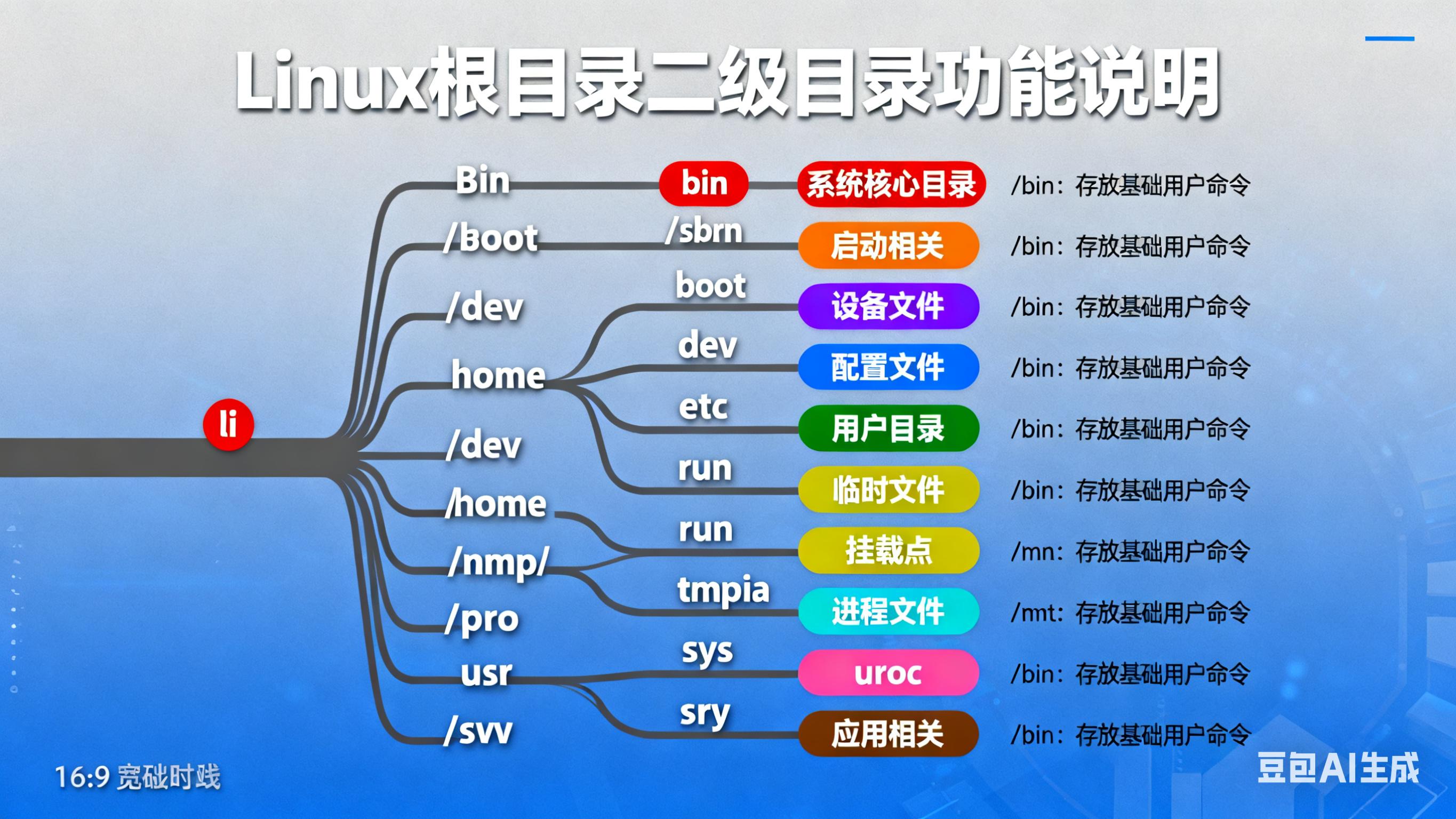 Linux是倒树形结构,顶级目录为"/"(根目录),系统遵循FHS(Filesystem Hierarchy Standard) Linux层级结构标准