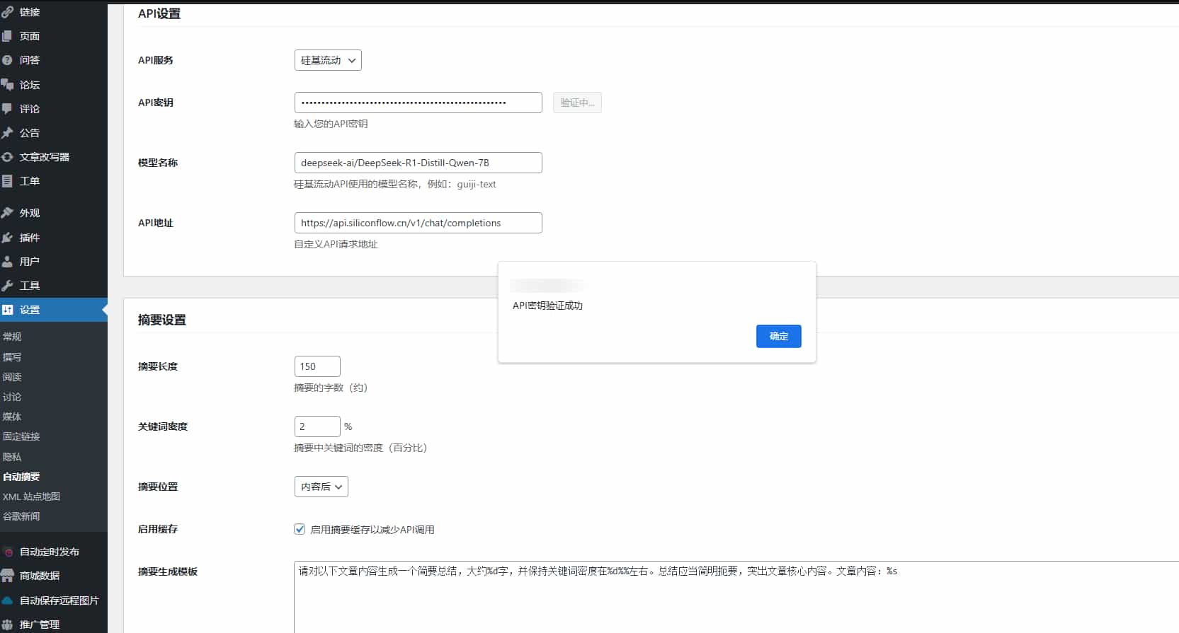3. 进入”设置” > “自动摘要”配置插件