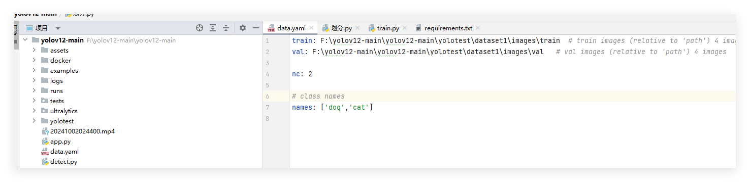 9.在data.yaml 数据配置文件中,配置数据的路径,names的顺序与classes.txt保持一致。