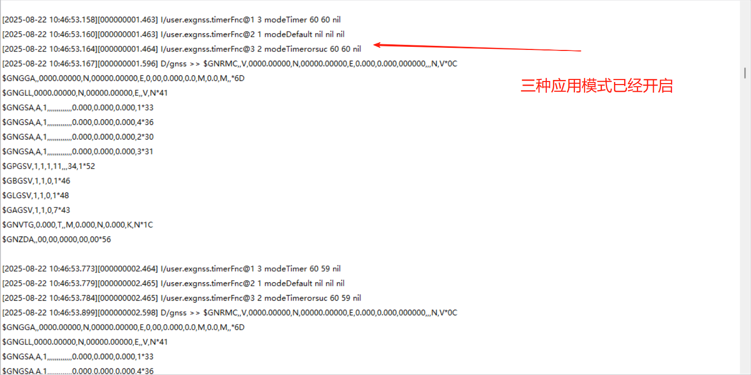 关于应用需要注意的是:使用 exgnss.close()关闭的只是对应的应用,所有应用关闭,gnss 也会关闭,这样做的好处是可以处理不同场景下的不同逻辑,比如服务器下发一条定位指令,定位成功之后关掉,这个时候又下发了一个指令需要长开启定位,这样两种指令就会冲突,需要代码去处理到底是不是要关掉 gnss,这个时候应用的好处就体现出来了,开启 exgnss.TIMERORSUC 第一个应用,定位成功之后关掉对应的应用,同时开启 exgnss.DEFAULT 第二个应用,gnss 就会常开,在应用 1 结束之后,只会对应用进行自动关闭,不会影响到第二个应用,gnss 还会处于常开状态。