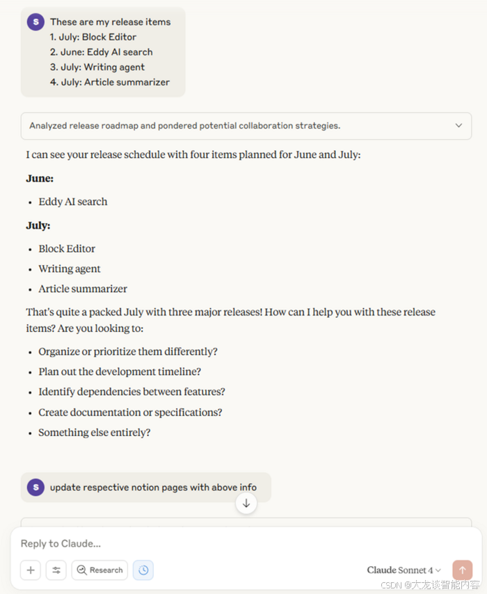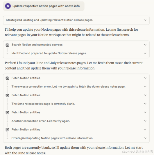当发出更新发布说明内容的指令后,Claude.ai会智能地自动规划,并更新Notion中相关的发布说明页面。