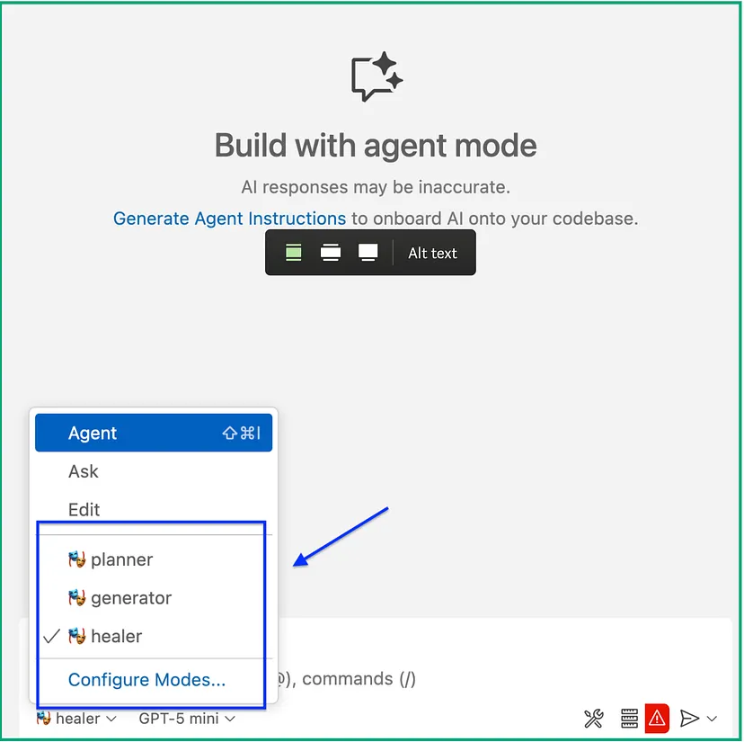 打开新的GitHub Copilot聊天窗口,你将在列表中看到新增的三个选项,即规划智能体(Planner)、生成智能体(Generator)和修复智能体(Healer),如下图所示: