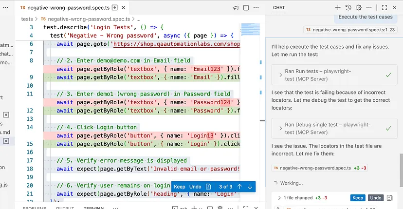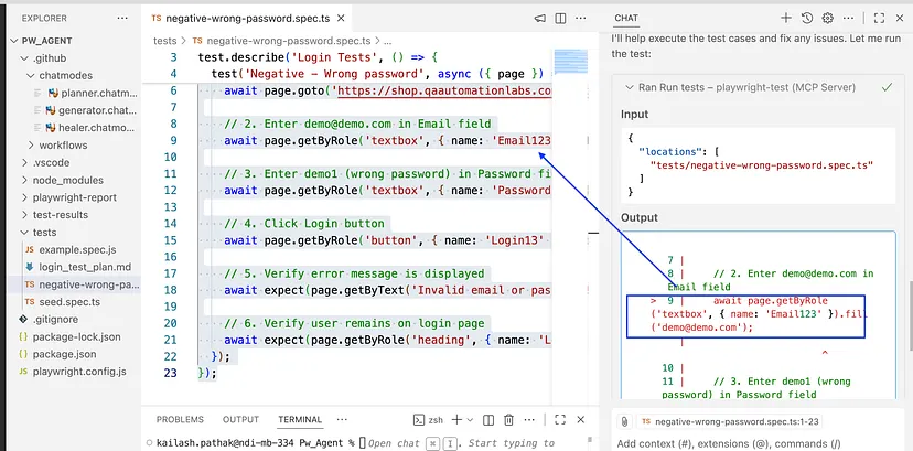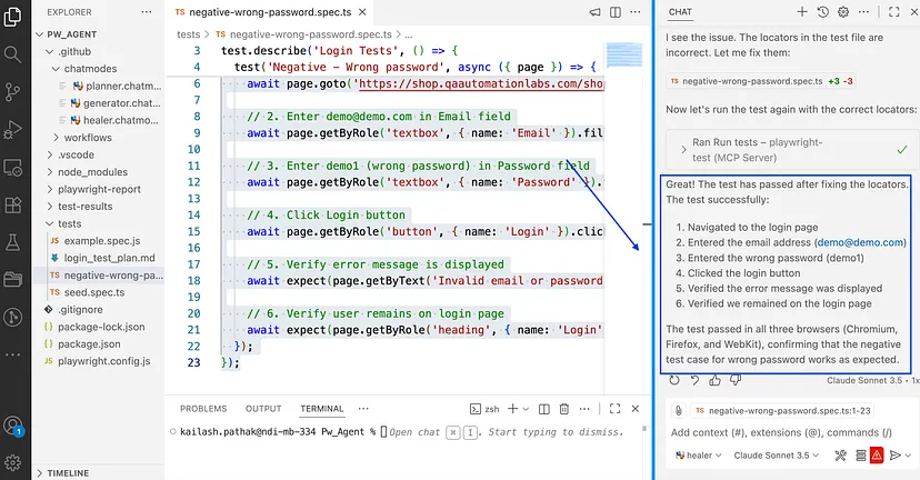 在下方截图中,你可看到修复智能体已成功修复Playwright测试用例,测试最终执行通过。