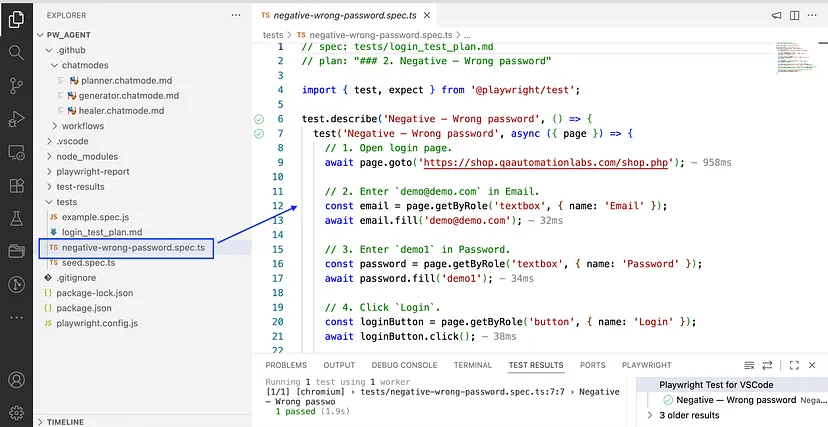 在下方截图中,你可看到系统已生成名为negative-wrong-password.spec.ts的测试文件(.spec文件)。