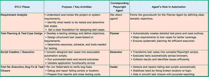 下面我们将逐一解读Playwright智能体,并探讨它们如何与传统软件测试生命周期(STLC)对应。