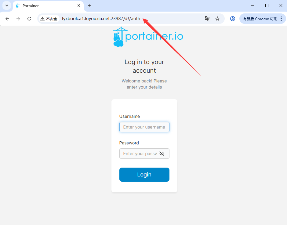 12,在外网电脑上,打开浏览器,在地址栏输入从路由侠生成的外网地址,就可以看到内网部署的 Portainer 界面了。