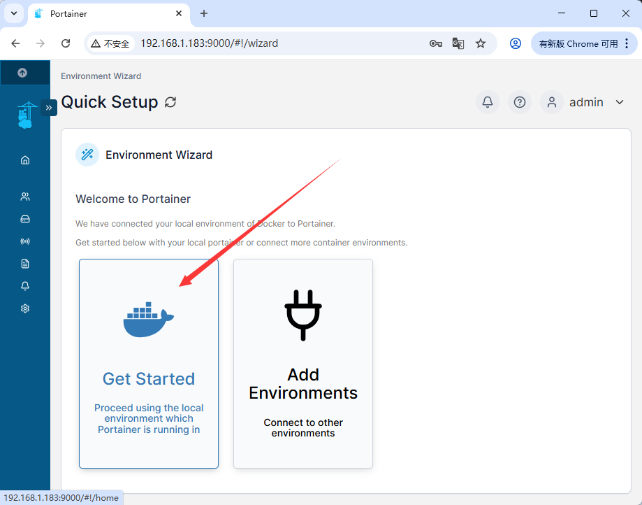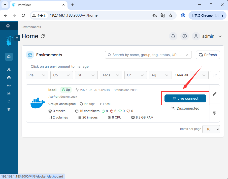 4,设置完管理员账户后,你需要选择要管理的 Docker 环境。对于初次部署,默认选项“ Local ”即代表当前这台机器上的 Docker 环境,通常无需修改直接点击【 Live connect 】即可。