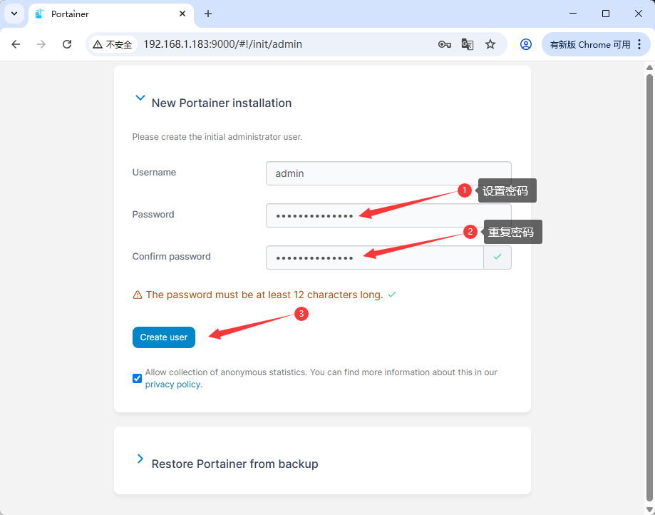 5,容器启动后,打开浏览器访问地址:http:// 本地服务器 IP :9000 ,首次访问时,Portainer 会要求你设置管理员账号和密码。