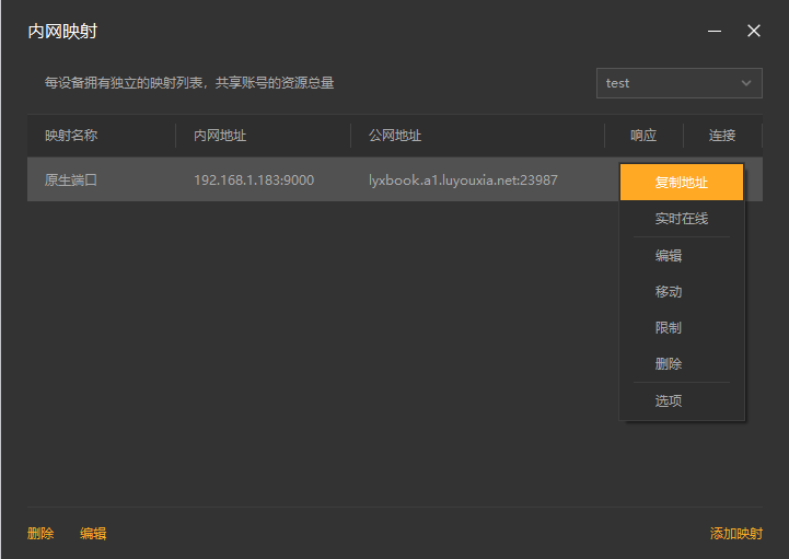 11,创建好后,就可以看到一条映射的公网地址,鼠标右键点击【复制地址】。