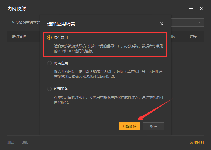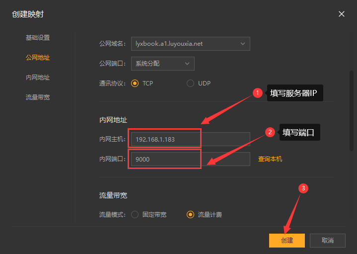 10,在内网地址里填写服务器 IP 和端口 9000 后点击【创建】按钮,如下图。