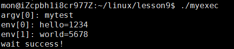 这里我们要用到main函数的参数argv,也就是我们之前讲过的命令行参数,我们让arg指针指向argv的第二个数据,因为第一个数据是我们要执行的文件,后面才是要怎么执行,并将argv的第一个数据传给execv的第一个参数,之后将arg指向的从下标为1开始的数组传给第二个参数。这里我以execvpe为例,我们这次让子进程来执行我们自己写的程序,程序的内容就是打印出命令行参数和环境变量,程序的结果我们