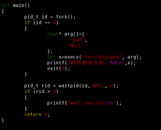 这次我们换个程序执行,也是我们熟悉的pwd命令,这个函数要传一个数组,数组中的内容最后一个也要是NULL,和execl是一样的。