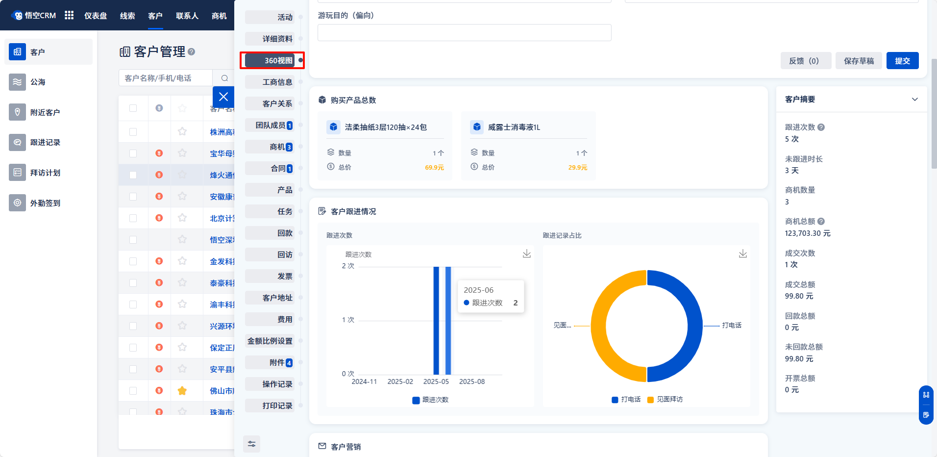 随着线索的积累,如何精准识别潜在客户并进行有效跟进成为关键。悟空AI CRM基于大数据分析和机器学习算法,为每个客户生成360°画像,涵盖客户背景、行为模式、偏好等信息。系统还能对客户线索进行智能评分,根据线索质量和转化可能性排序,自动分配给合适的销售代表,并提供跟进建议。在零售行业,一家连锁消费品品牌借助悟空AI CRM构建客户动态消费画像,实现个性化优惠推送与复购提醒,门店平均客单价提升了22%。