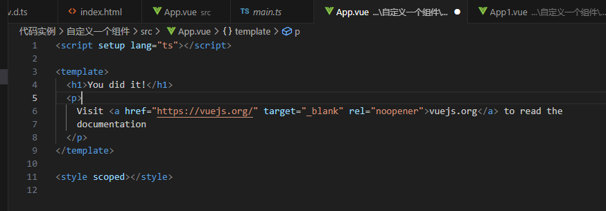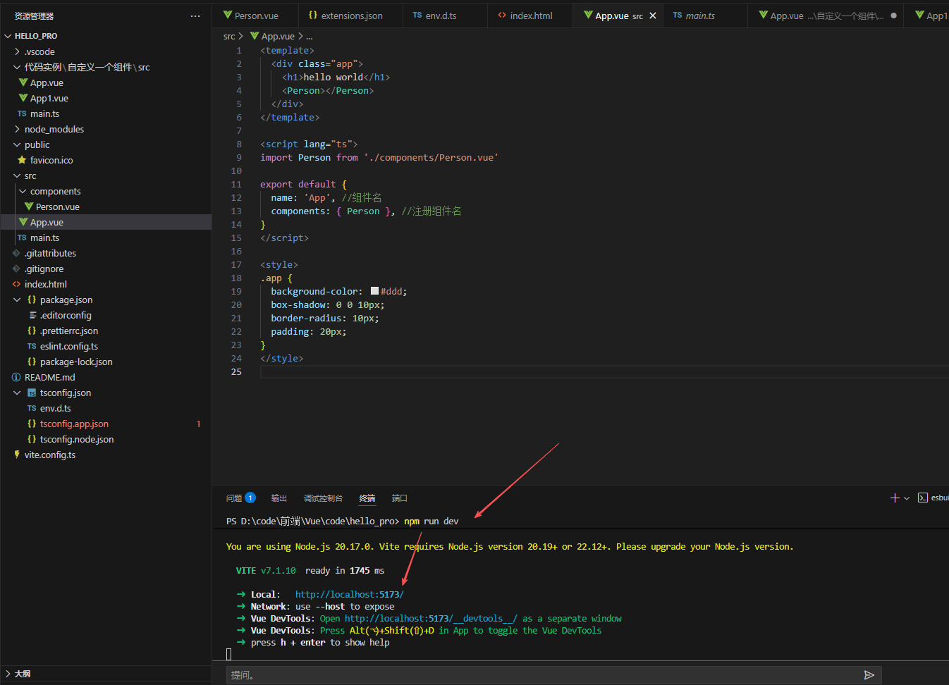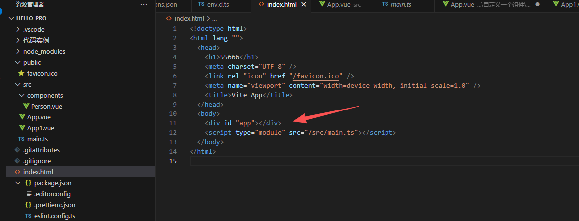 根据某站的vue教学视频,看万卷教程不如敲万行代码,根据教学进度整理对应代码,更快的熟悉这门语言vscode打开vite创建的项目,简单介绍我们常用到的项目文件env.d.ts :依赖引入,识别各自文件,常用的依赖都在里面public文件夹:保存css,js等静态文件Src文件夹:代码文件目录index.html:入口文件,引入main.ts依赖,调用app组件tsconfig等文件:ts配置文件