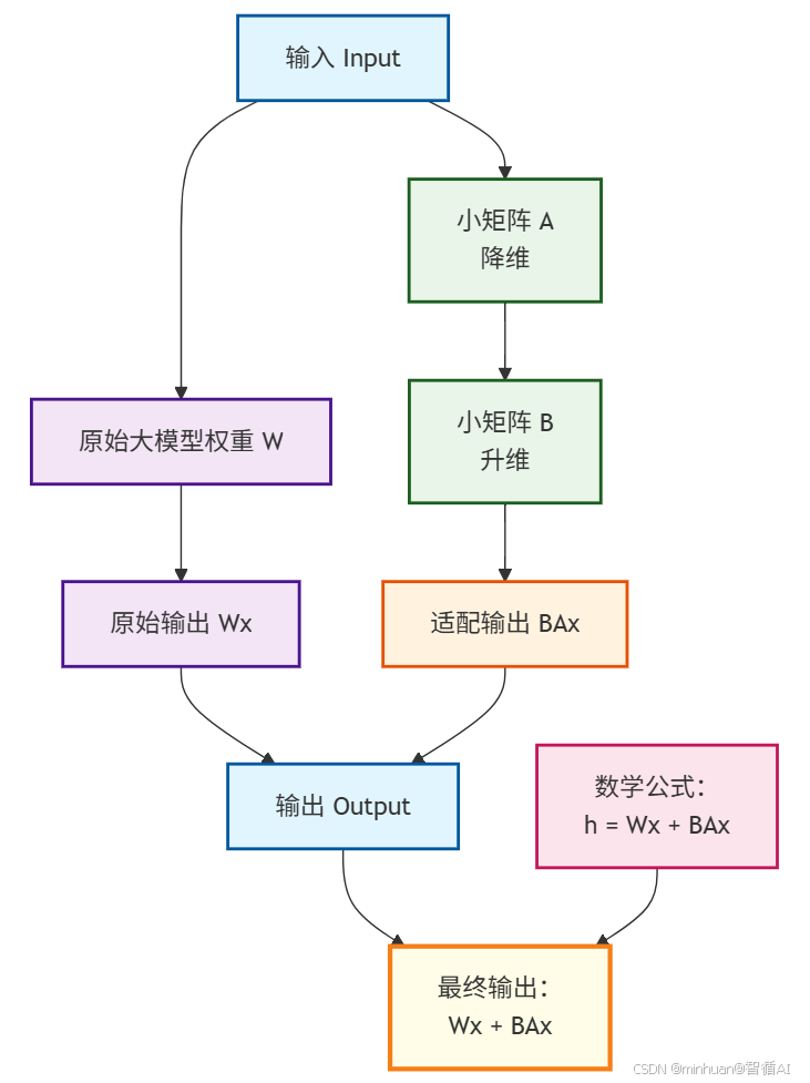 这个流程图清晰地展示了LoRA如何通过引入两个小矩阵A和B,在不改变原始权重W的情况下实现对模型的高效微调。