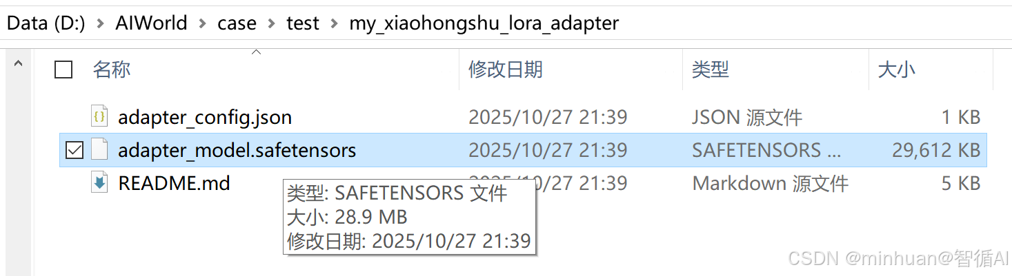 训练完成后,你会在 ./my_xiaohongshu_lora_adapter 文件夹里找到几个文件,这就是LoRA适配器,可能只有几十MB。