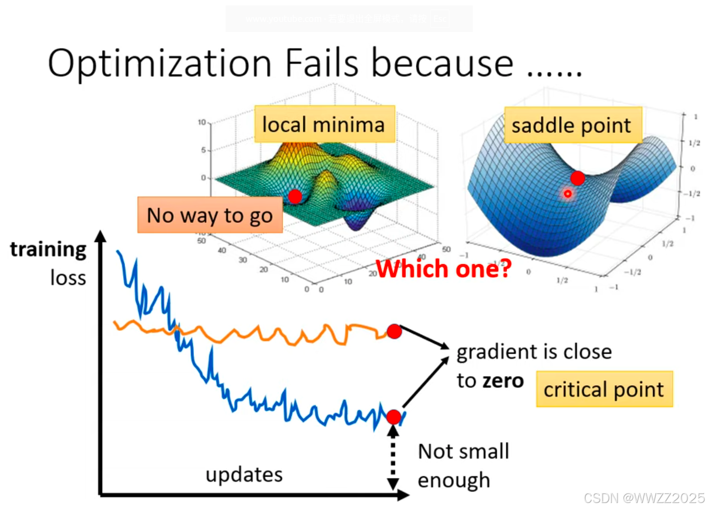 临界点分为局部最小值(local minima)和鞍点(saddle point),这两个区分如下。