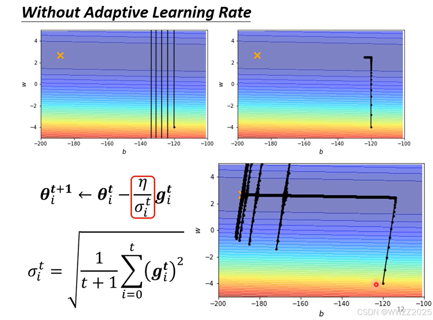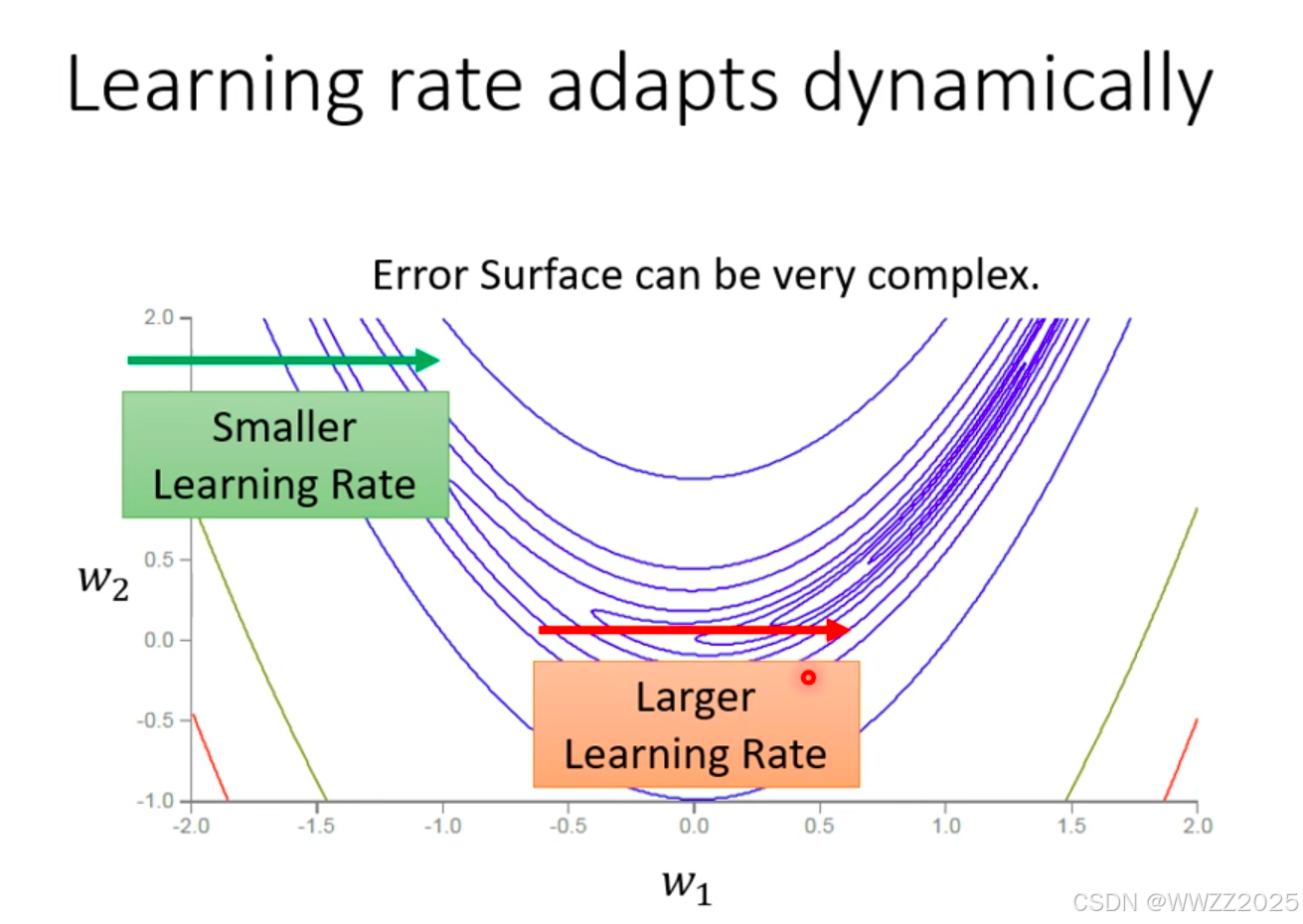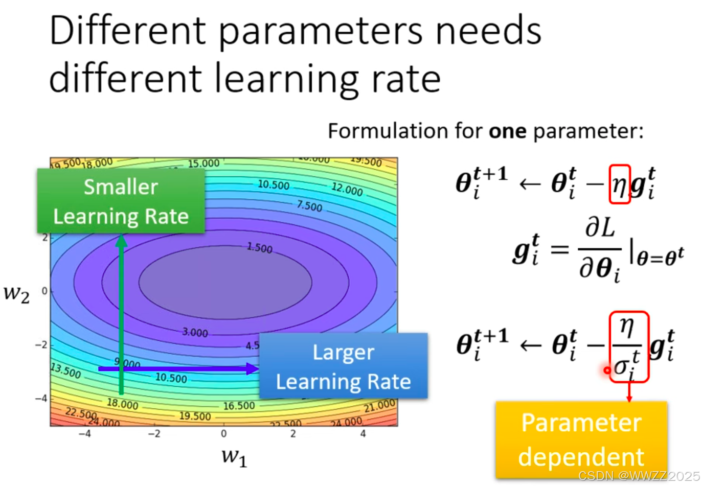 训练时使用固定的学习率会导致梯度降不下去,因此在某一方向上梯度下降值很小(平坦),学习率调大一点;反之小一点。