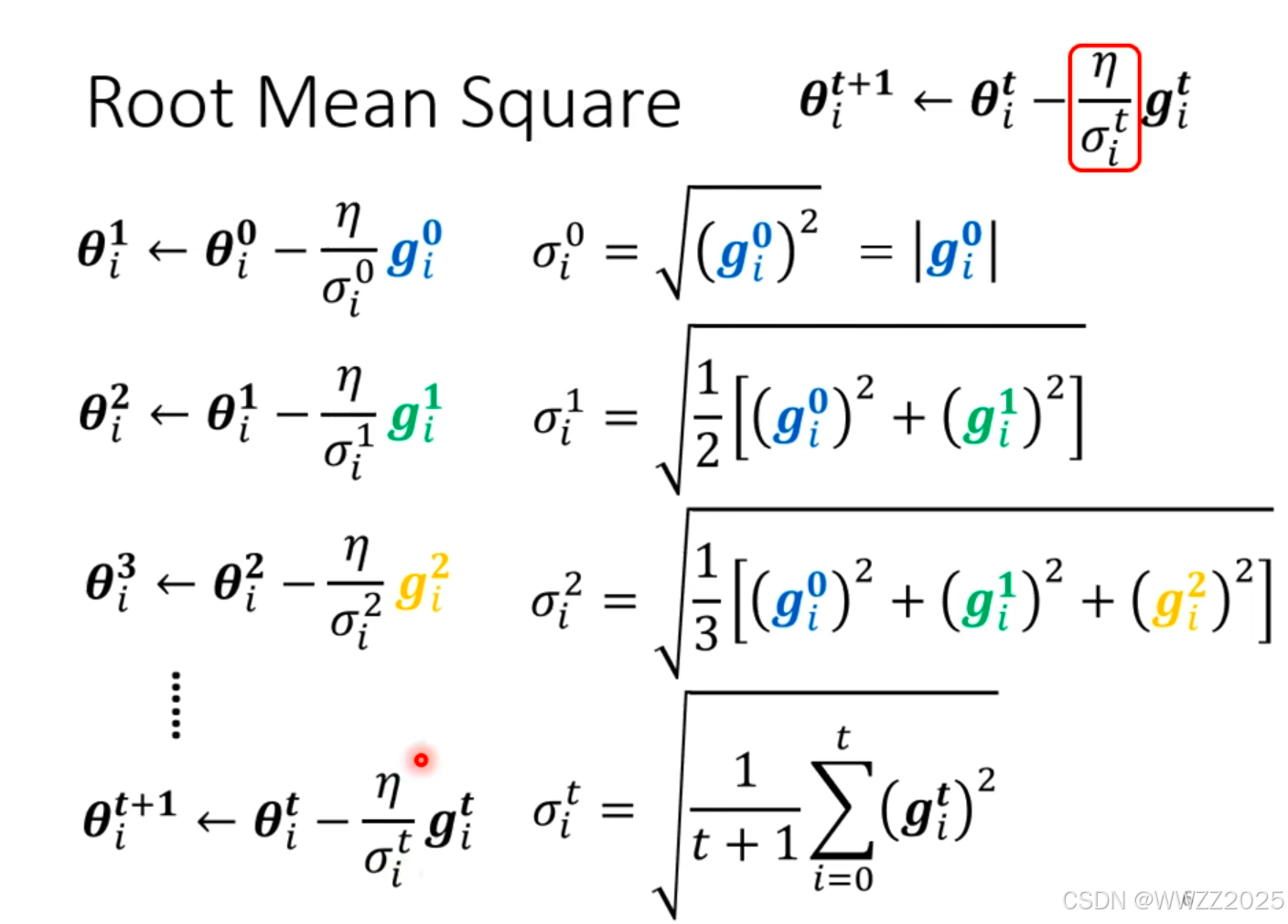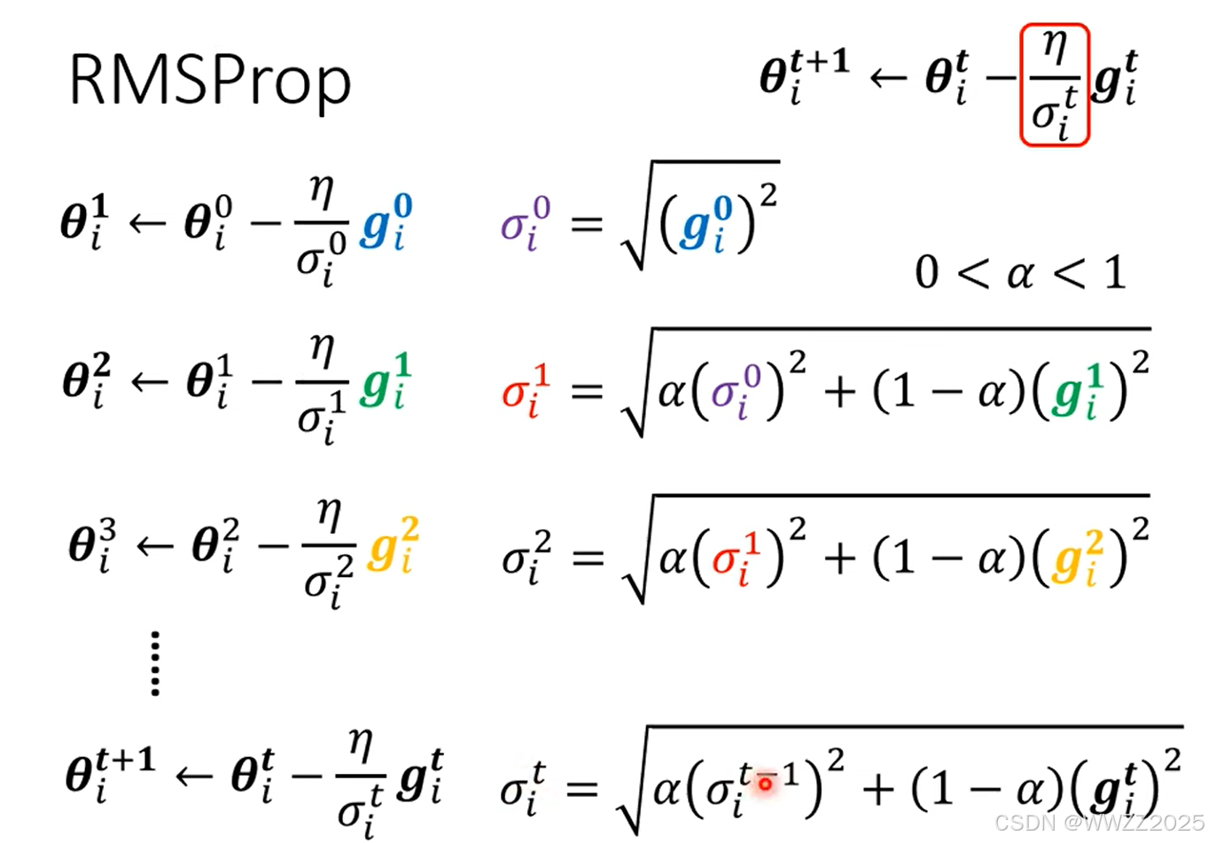 但是,在同方向上坡度仍有出入,绿线坡度陡峭,学习率需调小;红线坡度较平缓,学习率应较大,因此采用RMSProp法: