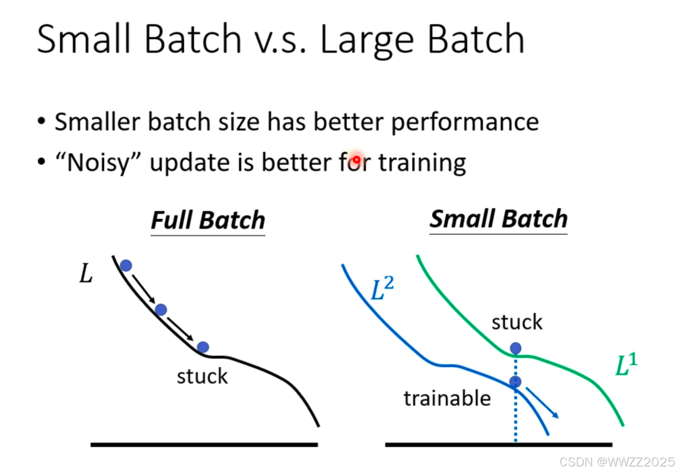 小样本批次存在噪声(Noisy),L1中找到的最小值在L2中不一定是最小 ,在L2中还能继续找最小。