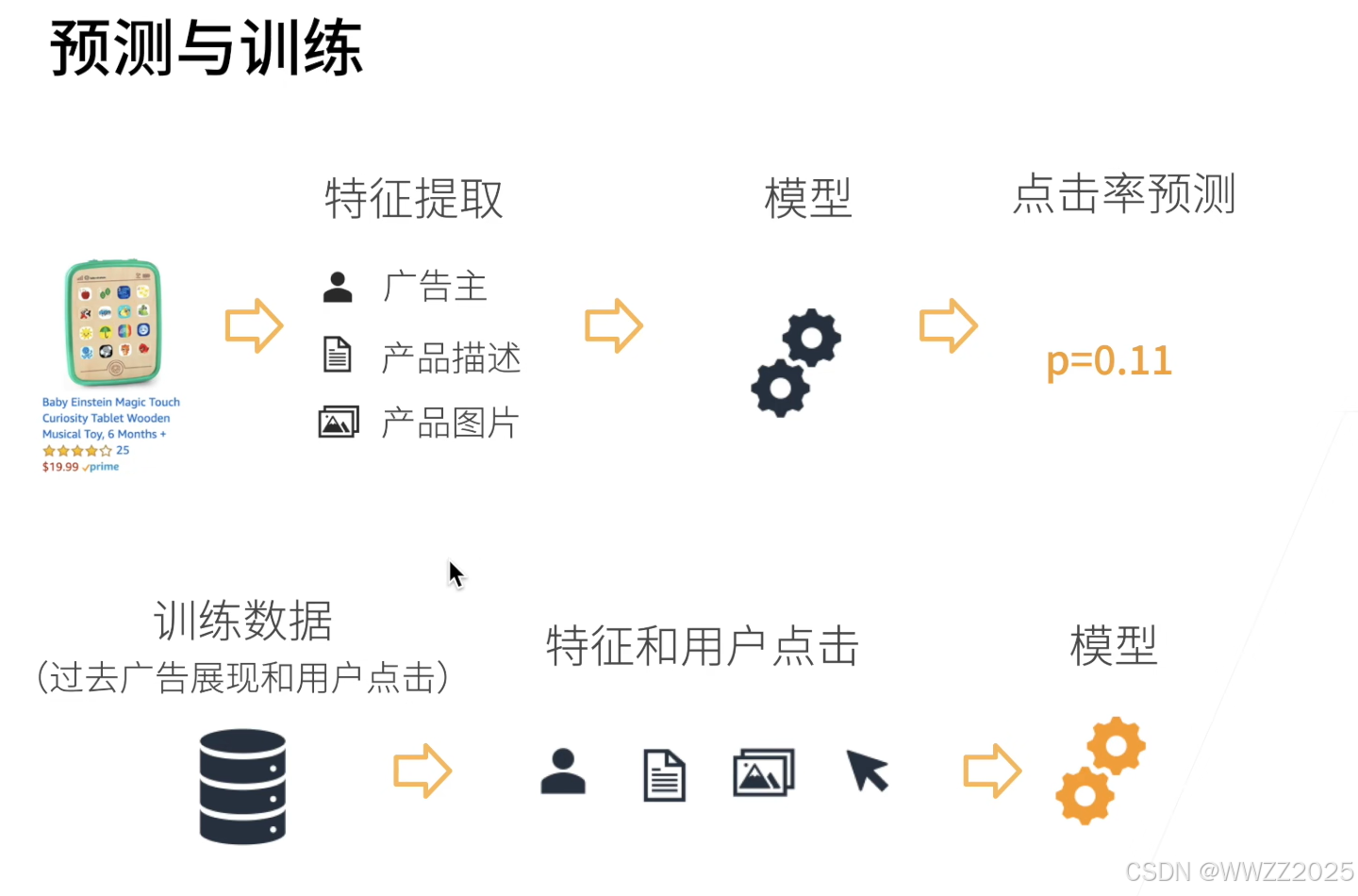 电商商品推荐,当用户搜索目标商品时,后台会根据客户搜索的词条找到商城中所有个这个词条相关的商品,然后进行特征提取(此处为广告主、产品描述、产品图片),将特征提取放入模型进行训练,得到预测的客户可能点击的概率,用户页面看到的商品排序为预测的点击率*平台对该链接的提成。