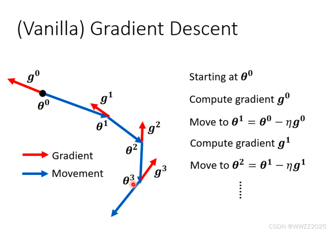 梯度下降时,沿着梯度运算的反方向运动,如图蓝色线。