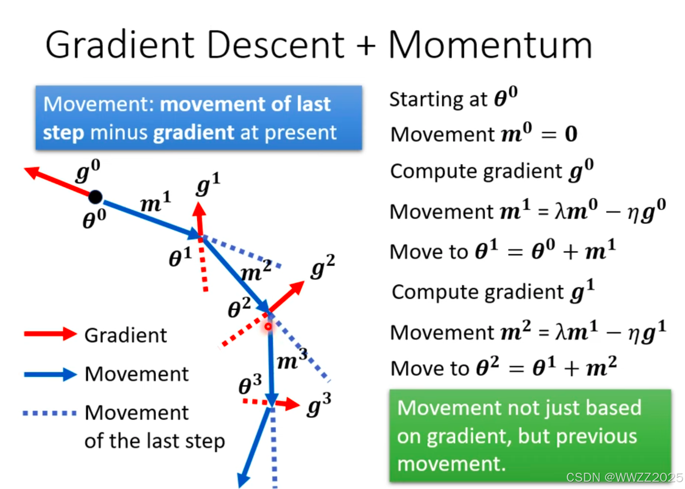 因动量的加入,梯度运动不再仅受梯度下降方向影响,还和上一时刻动量方向有关,实际梯度走向为梯度方向+上一时刻动量方向之和,如图蓝色实线。
