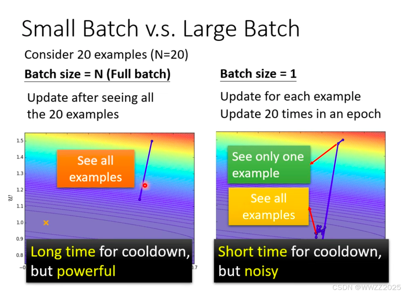 假设20个样本,左图在看完所有样本后输出损失函数L,进而运算