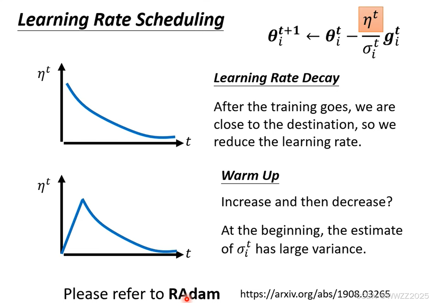 ,常用方法有学习率衰减(Learning Rate Decay),其随着时间逐渐减小;还可以用预热(Warm Up),其随着时间先大后小。