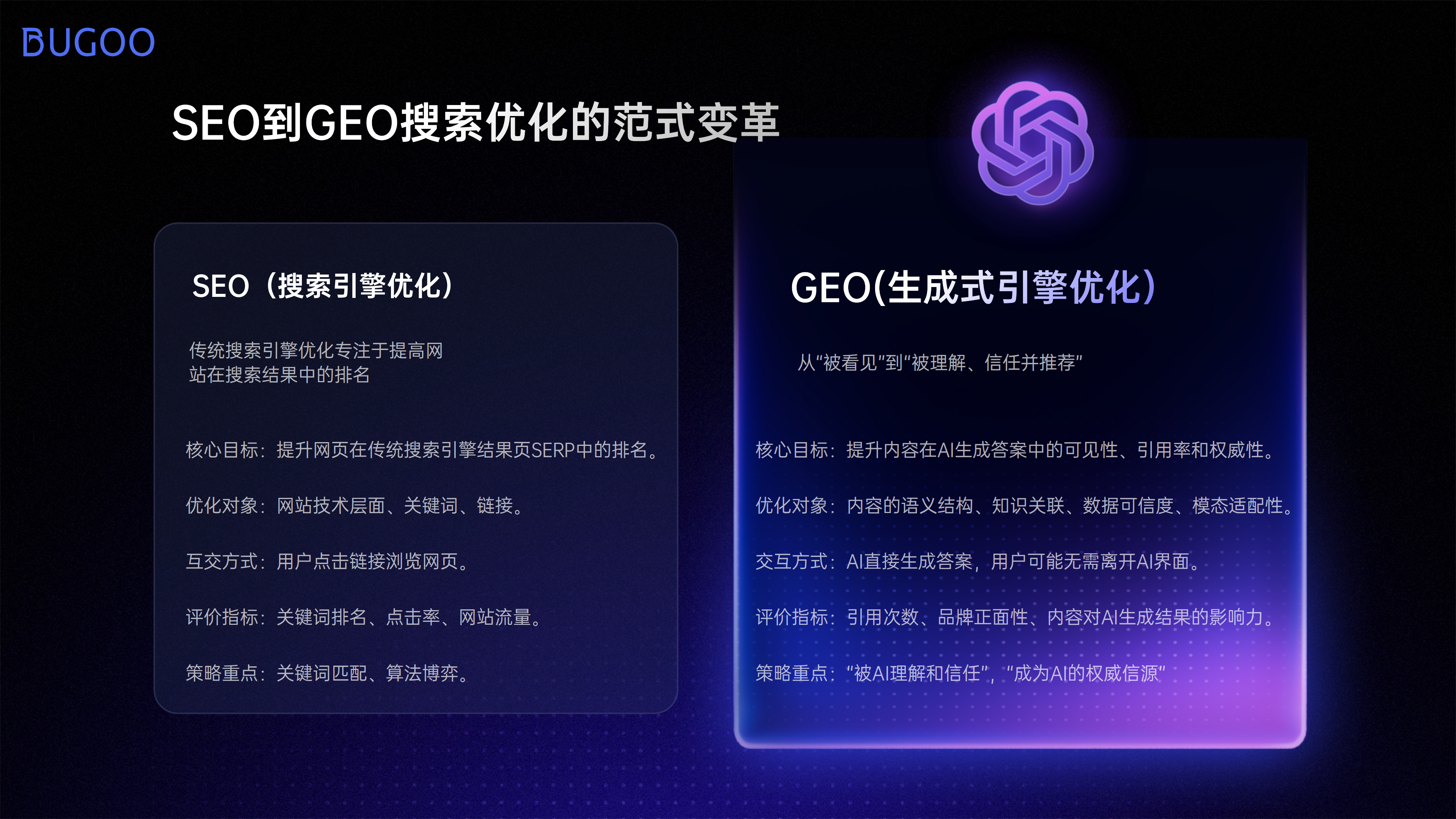 GEO的核心目标是让品牌内容成为AI生成答案的优先信源,其与传统SEO的本质差异可通过下表对比: